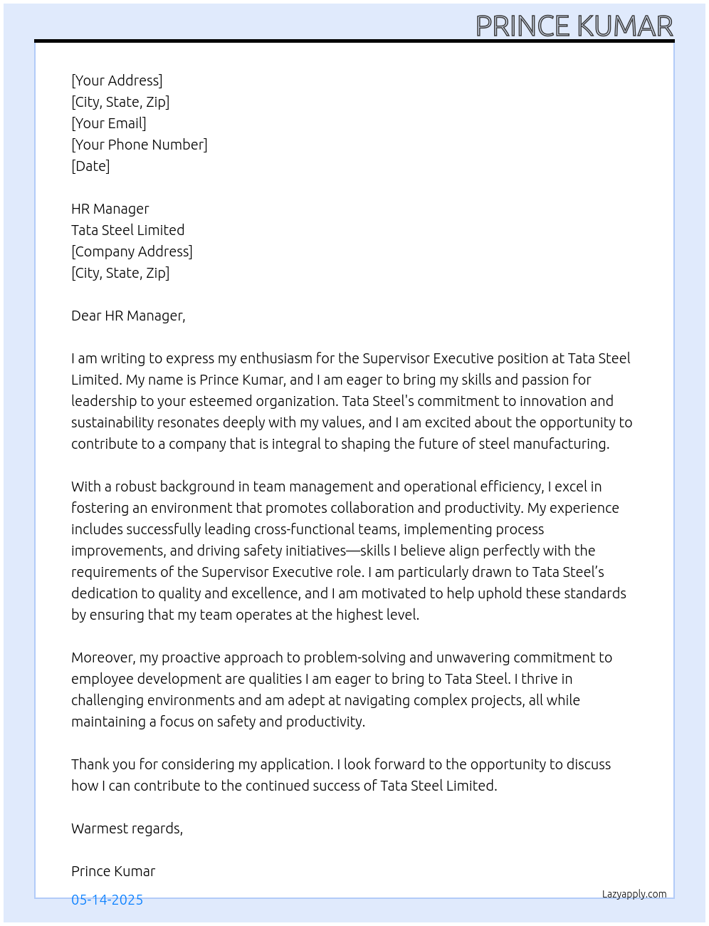 SUPERVISOR, EXECUTIVE Cover Letter At Tata Steel Limited