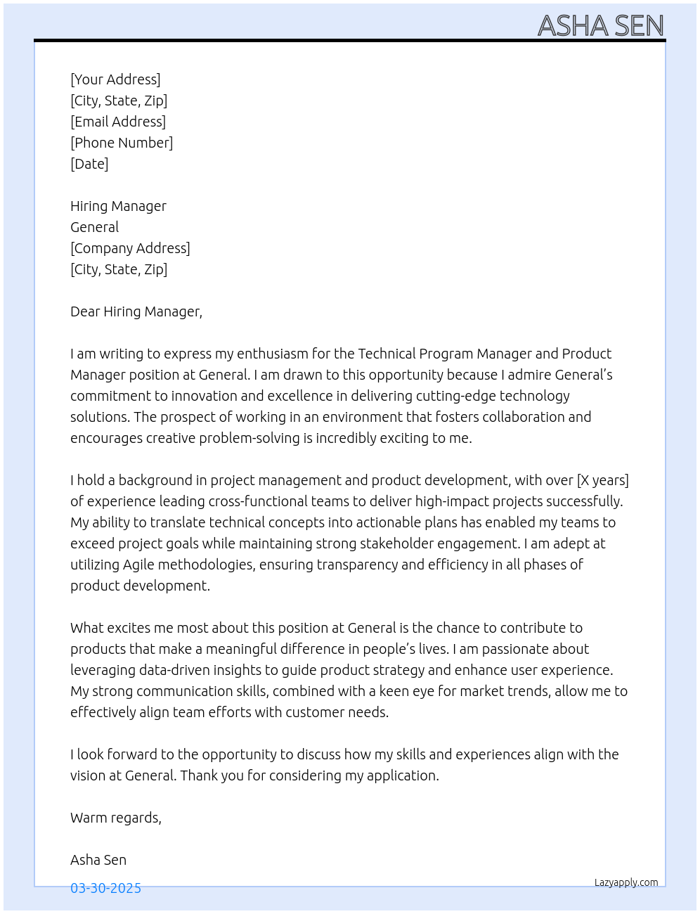 Technical Program Manager AND Product Manager Cover Letter At general