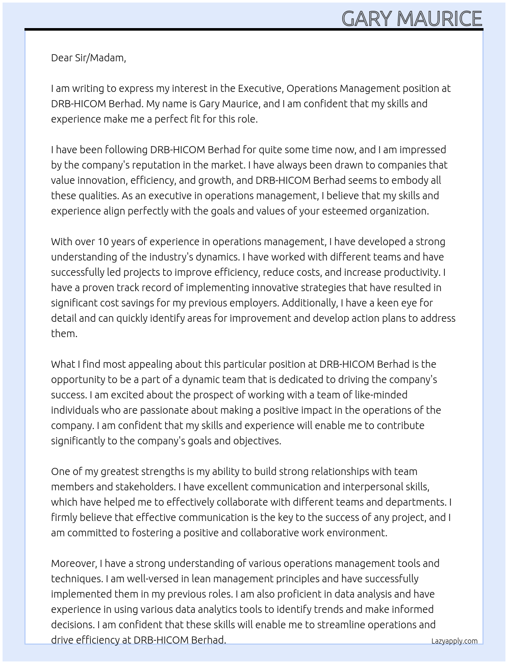 Executive, Operations Management Cover Letter At DRB-HICOM Berhad