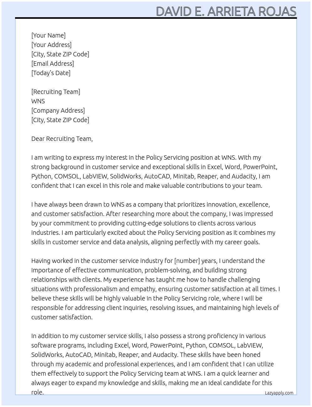 Check out these policy servicing cover letter sample and examples previously used by job seekers to land on job interviews as policy servicing. Use our AI cover letter generator to create a personalized cover letter as policy servicing.