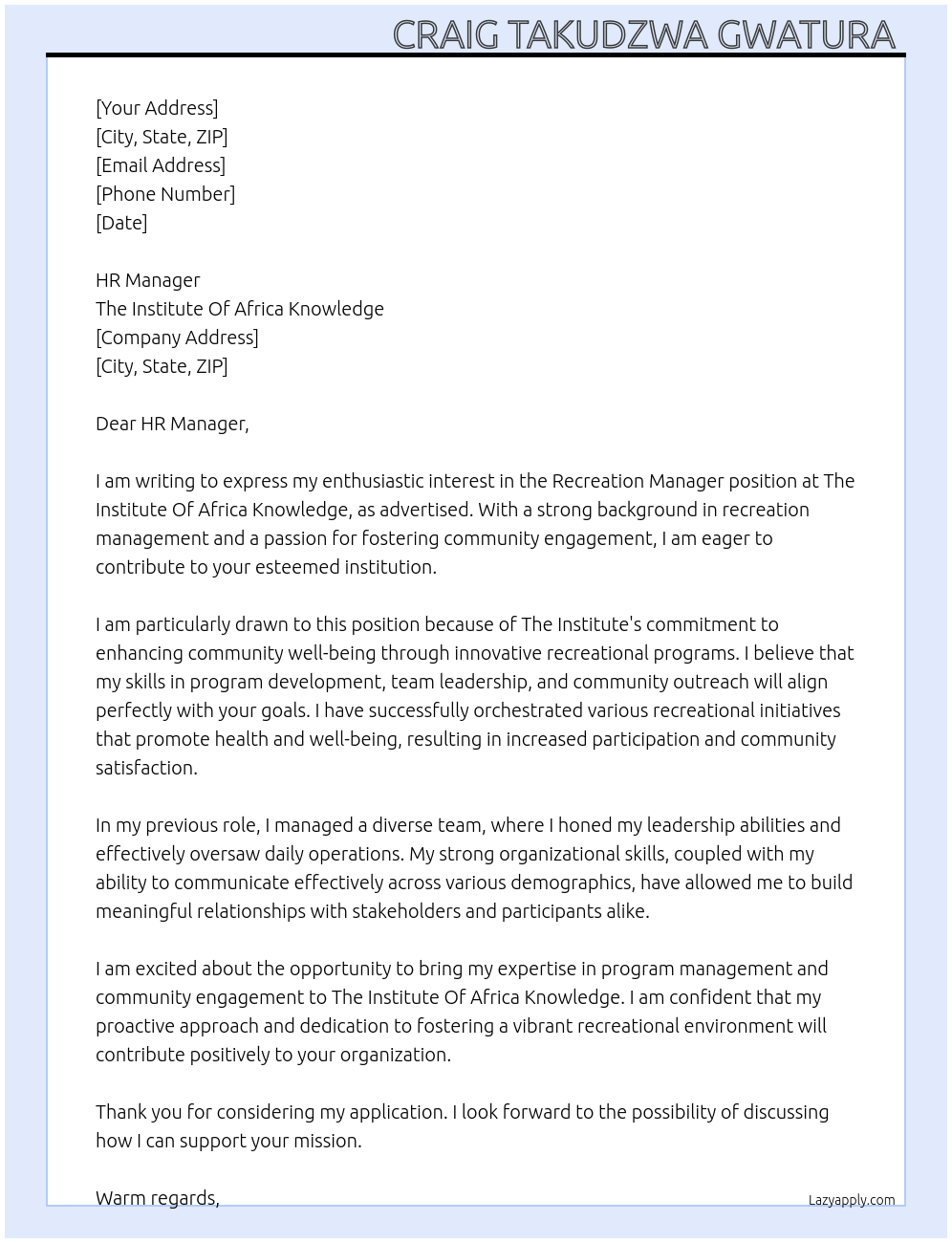 Recreation manager Cover Letter At The Institute Of Africa Knowledge