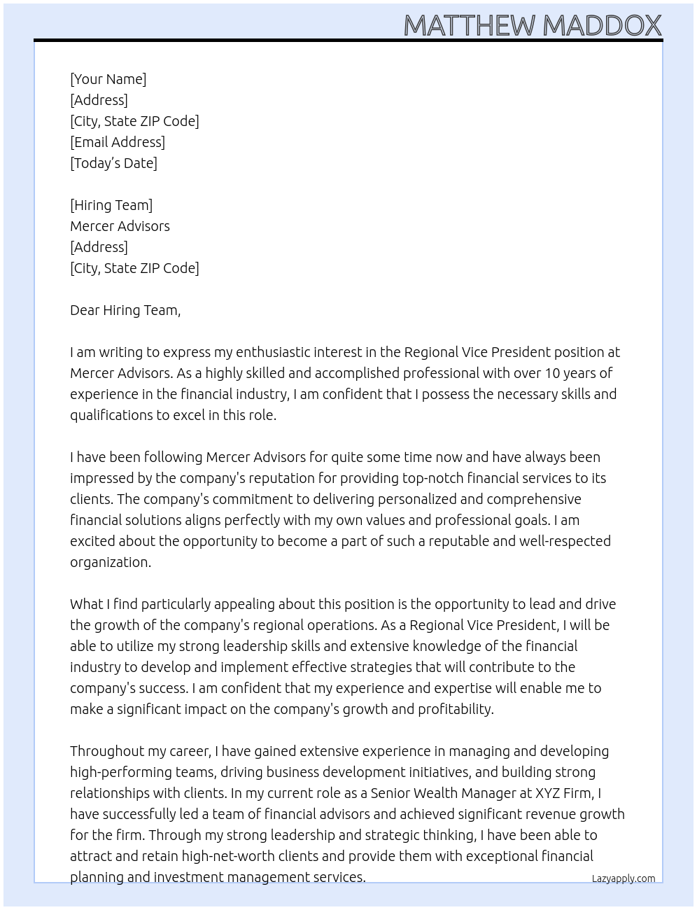 Check out these regional vice president cover letter sample and examples previously used by job seekers to land on job interviews as regional vice president. Use our AI cover letter generator to create a personalized cover letter as regional vice president.
