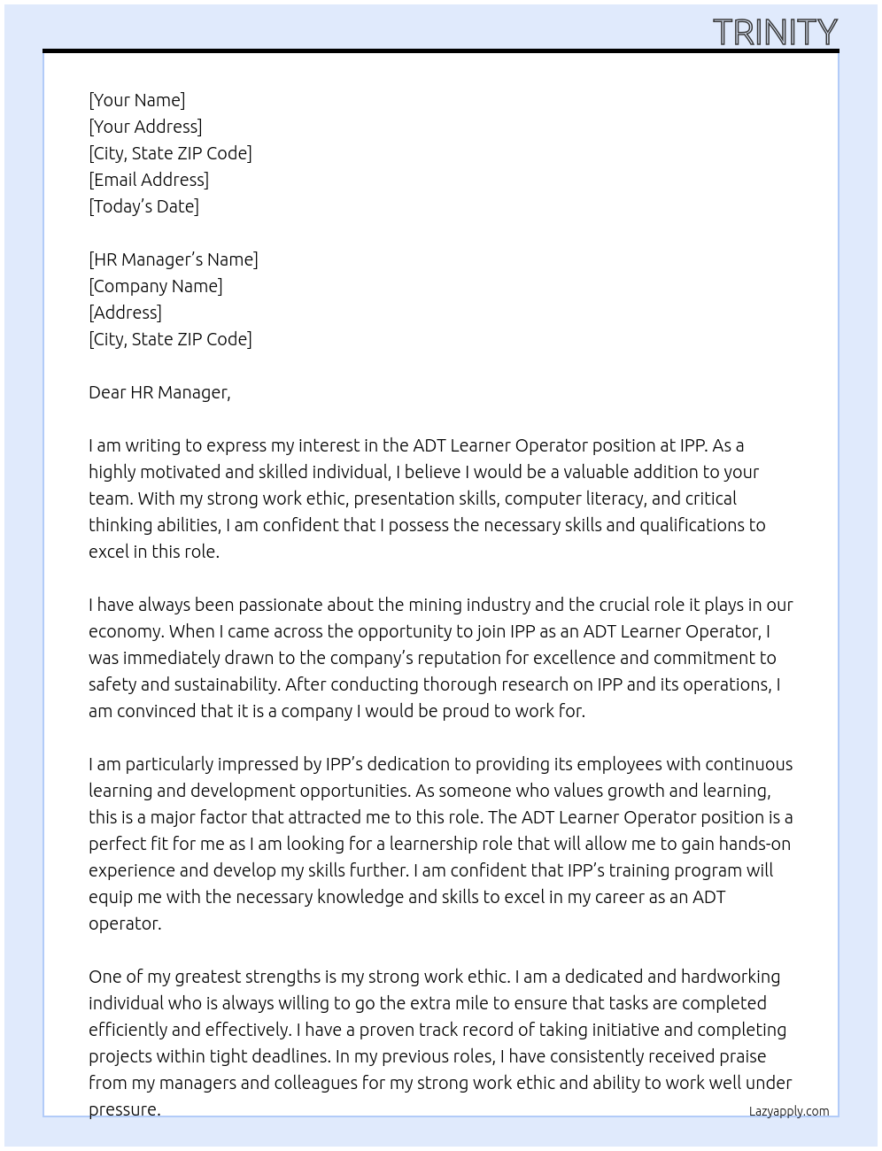 Check out these adt learner operator cover letter sample and examples previously used by job seekers to land on job interviews as adt learner operator. Use our AI cover letter generator to create a personalized cover letter as adt learner operator.