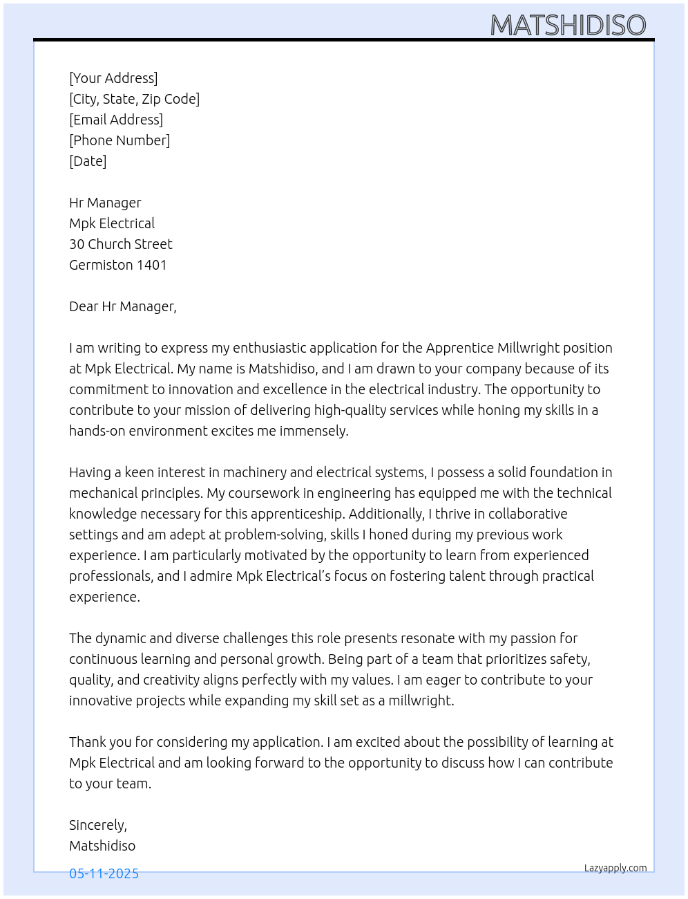Check out these apprentice millwright cover letter sample and examples previously used by job seekers to land on job interviews as apprentice millwright. Use our AI cover letter generator to create a personalized cover letter as apprentice millwright.