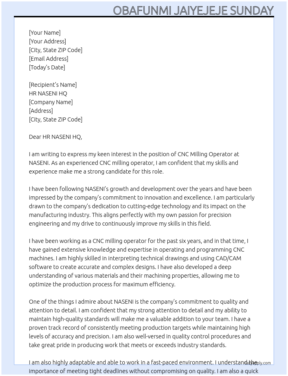 Cnc Milling Operator Cover Letter Examples And Template