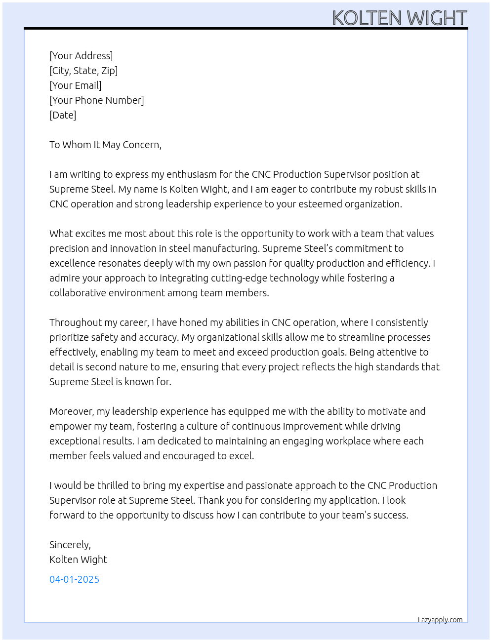 CNC Production Supervisor Cover Letter At Supreme Steel