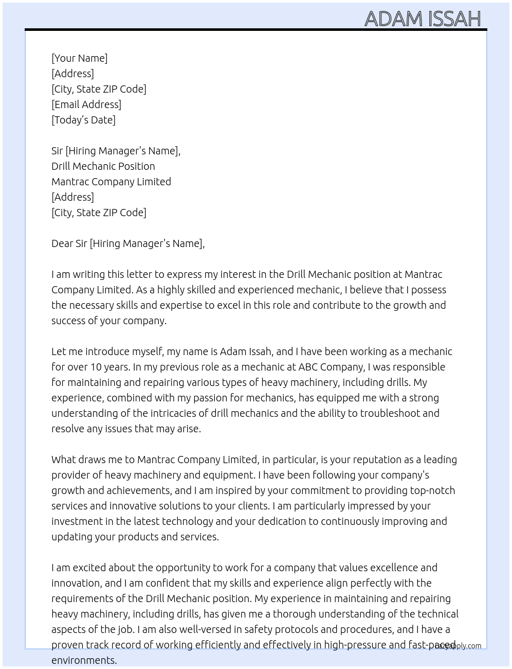 Check out these drill mechanic cover letter sample and examples previously used by job seekers to land on job interviews as drill mechanic. Use our AI cover letter generator to create a personalized cover letter as drill mechanic.
