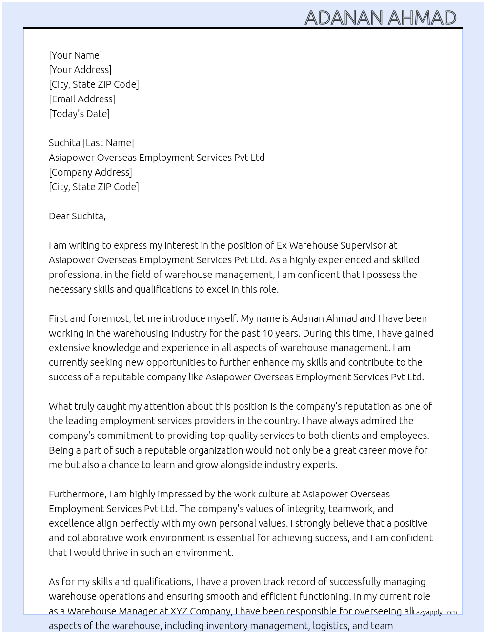 Ex warehouse supervisor Cover Letter At Asiapower overseas employment services Pvt Ltd