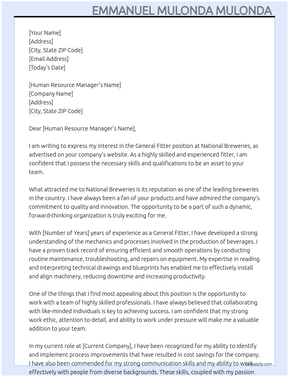 Check out these general fitter cover letter sample and examples previously used by job seekers to land on job interviews as general fitter. Use our AI cover letter generator to create a personalized cover letter as general fitter.
