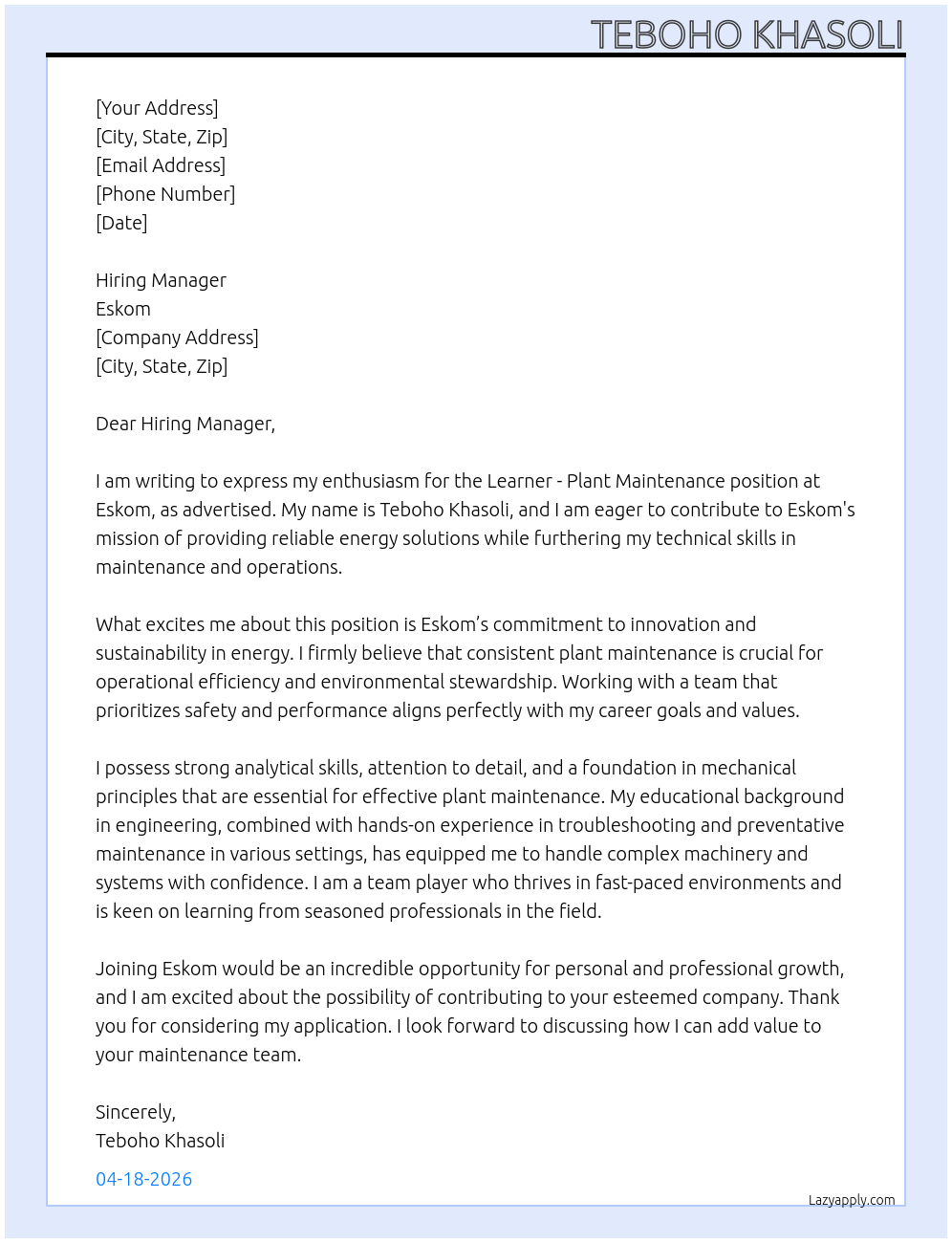 Check out these learner- plant maintenance cover letter sample and examples previously used by job seekers to land on job interviews as learner- plant maintenance. Use our AI cover letter generator to create a personalized cover letter as learner- plant maintenance.