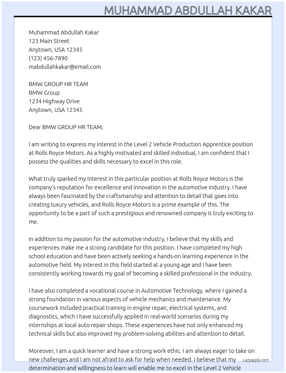 Level 2 Vehicle Production Apprentice Cover Letter At Rolls Royce Motors