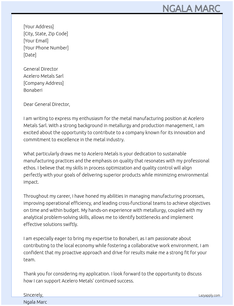 Metal manufacturing Cover Letter At Acelero Metals sarl