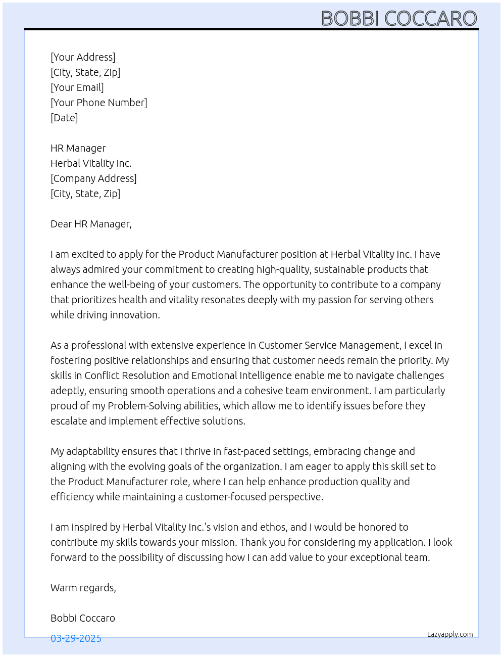 Product Manufacturer Cover Letter At Herbal Vitality Inc.
