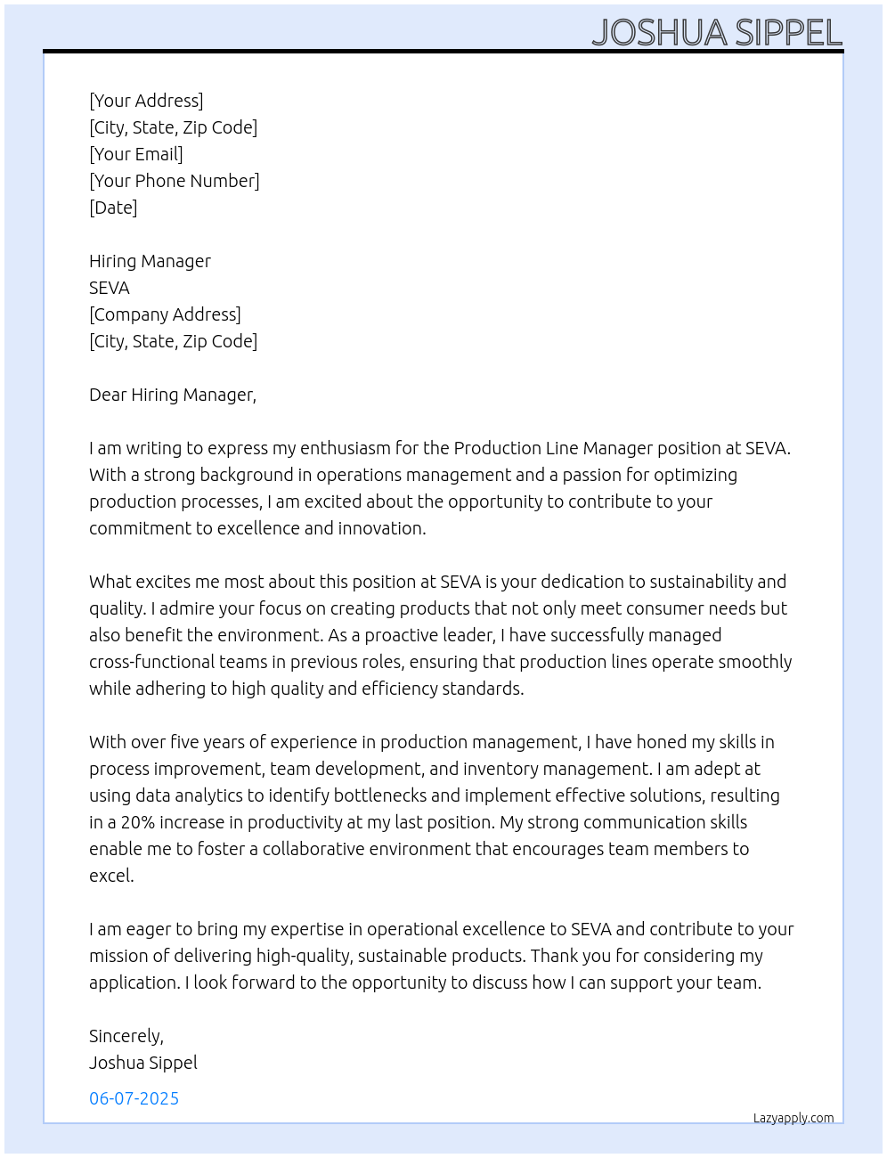 Check out these production line manager cover letter sample and examples previously used by job seekers to land on job interviews as production line manager. Use our AI cover letter generator to create a personalized cover letter as production line manager.