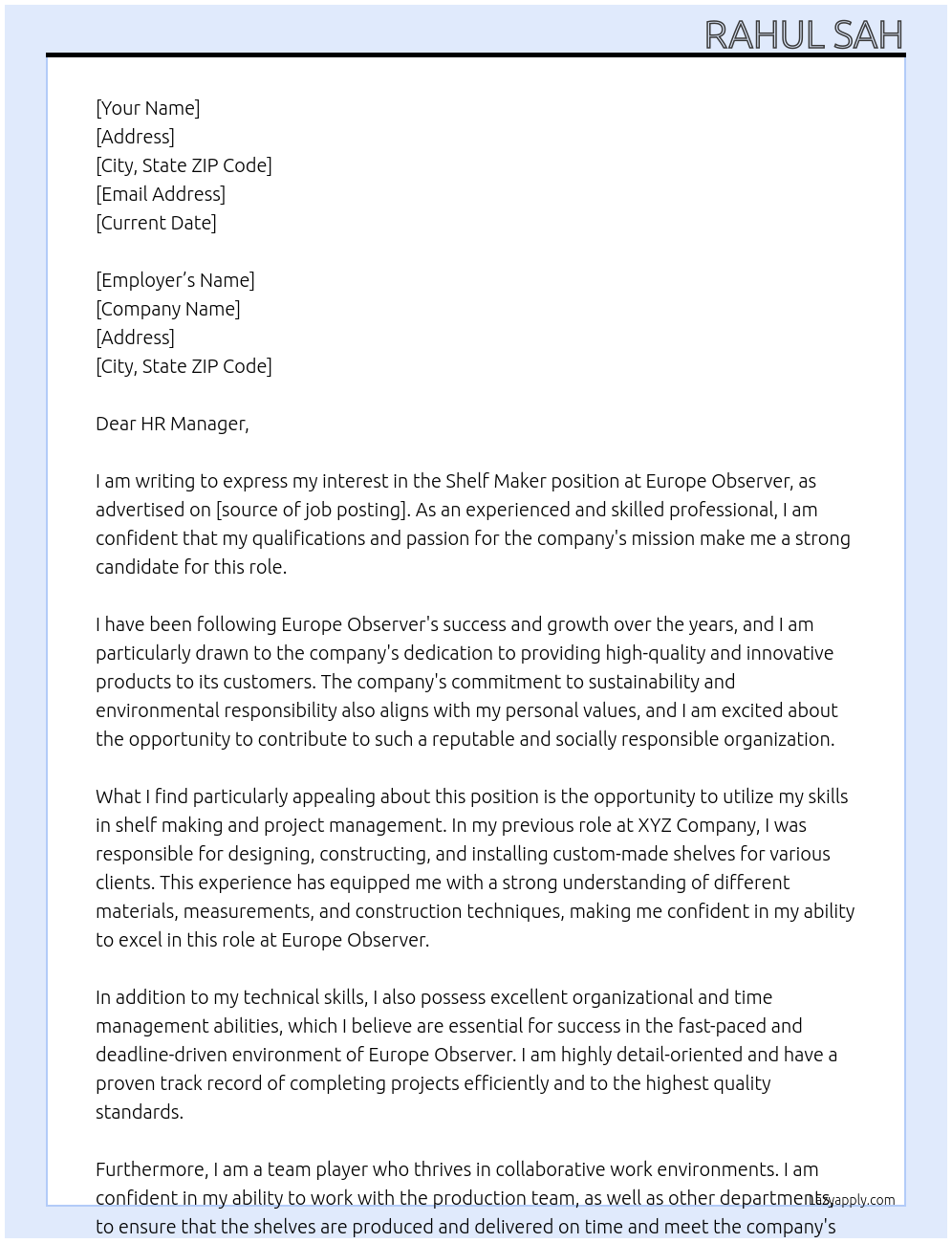 Check out these shelf maker cover letter sample and examples previously used by job seekers to land on job interviews as shelf maker. Use our AI cover letter generator to create a personalized cover letter as shelf maker.