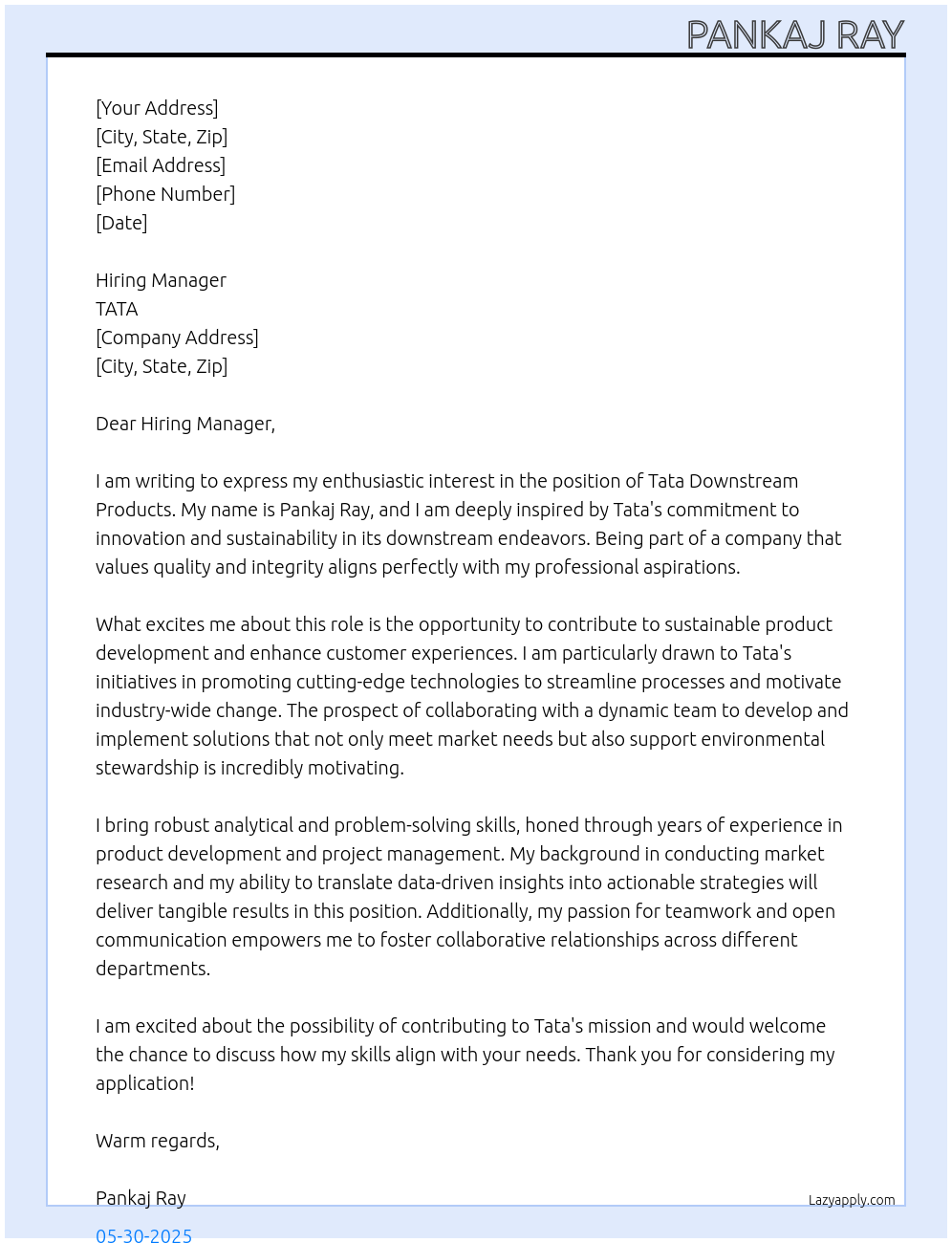 Check out these tata downstream prodcuts cover letter sample and examples previously used by job seekers to land on job interviews as tata downstream prodcuts. Use our AI cover letter generator to create a personalized cover letter as tata downstream prodcuts.