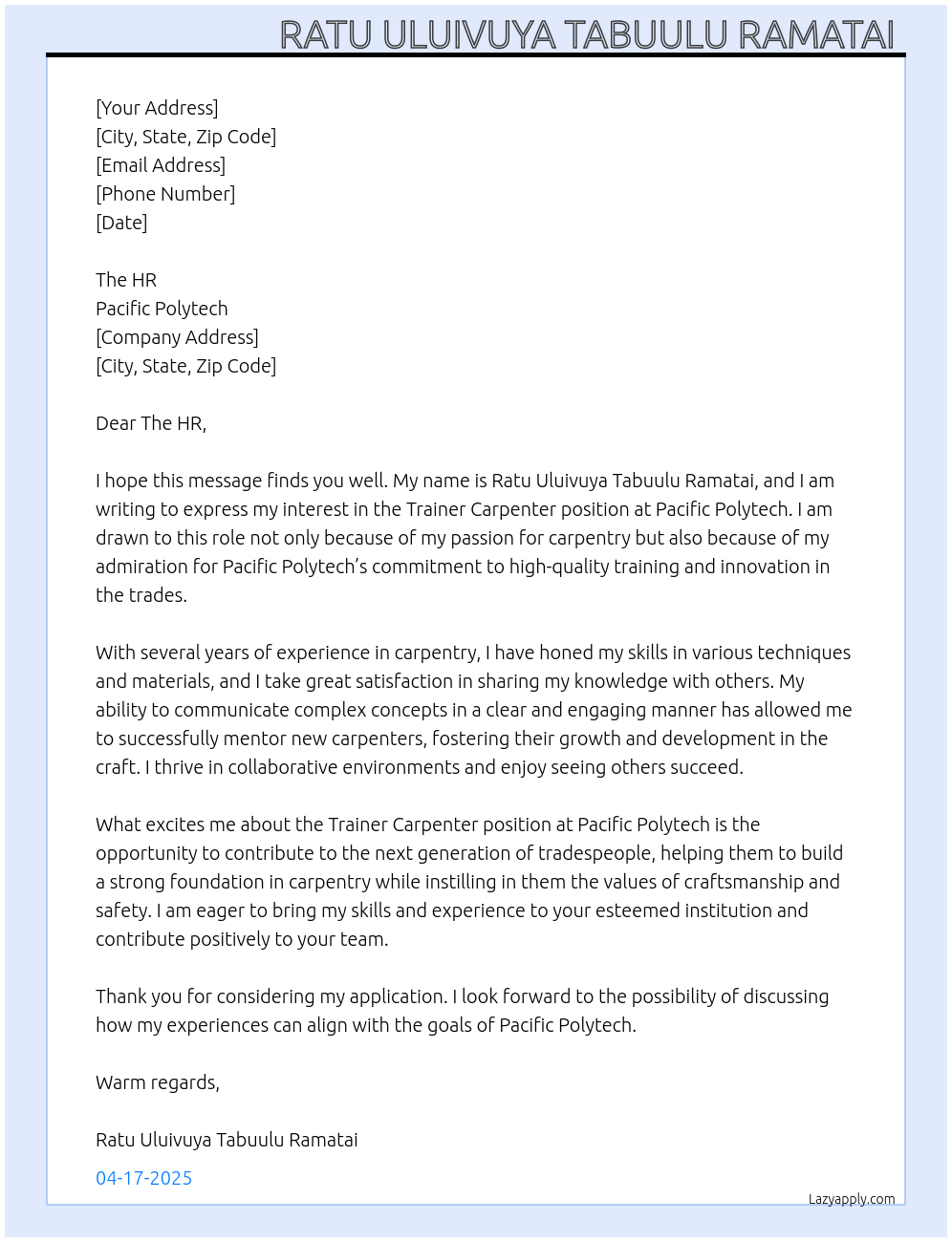 Check out these trainer carpenter cover letter sample and examples previously used by job seekers to land on job interviews as trainer carpenter. Use our AI cover letter generator to create a personalized cover letter as trainer carpenter.
