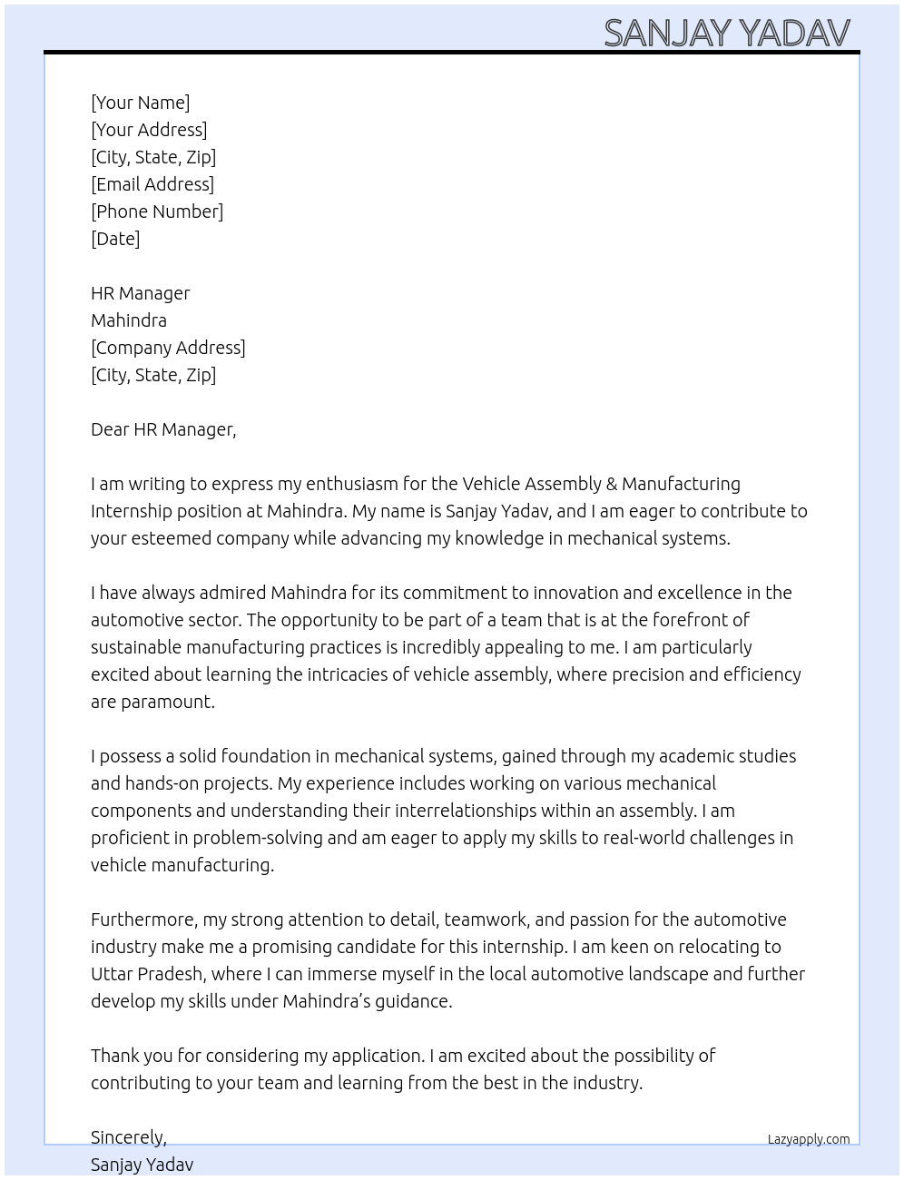 vehicle Assembly & Manufacturing Cover Letter At Mahindra