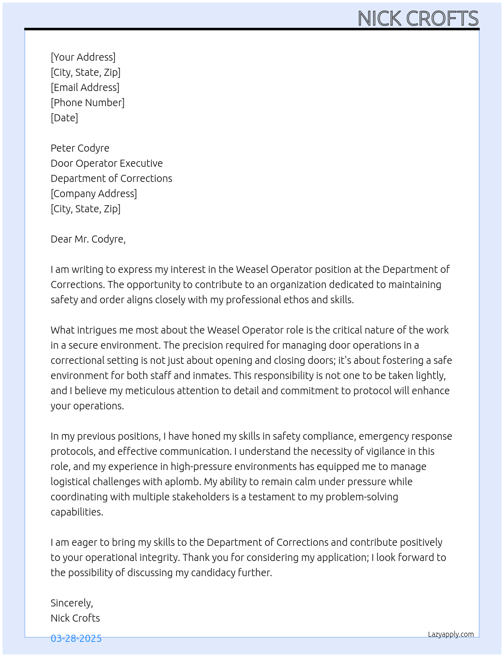 Check out these weasel operator cover letter sample and examples previously used by job seekers to land on job interviews as weasel operator. Use our AI cover letter generator to create a personalized cover letter as weasel operator.