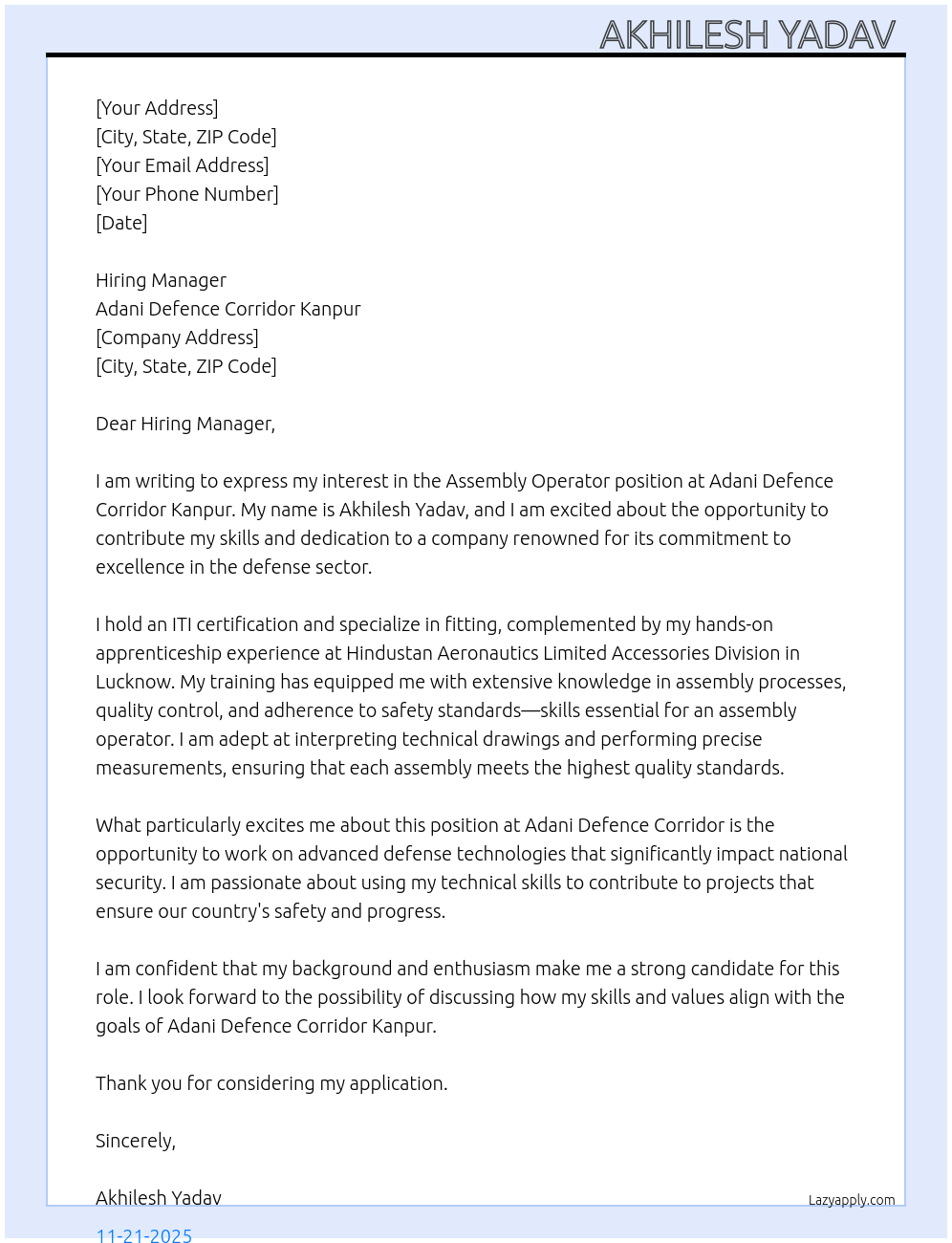 Assembly operator Cover Letter At Adani defence corridor kanpur