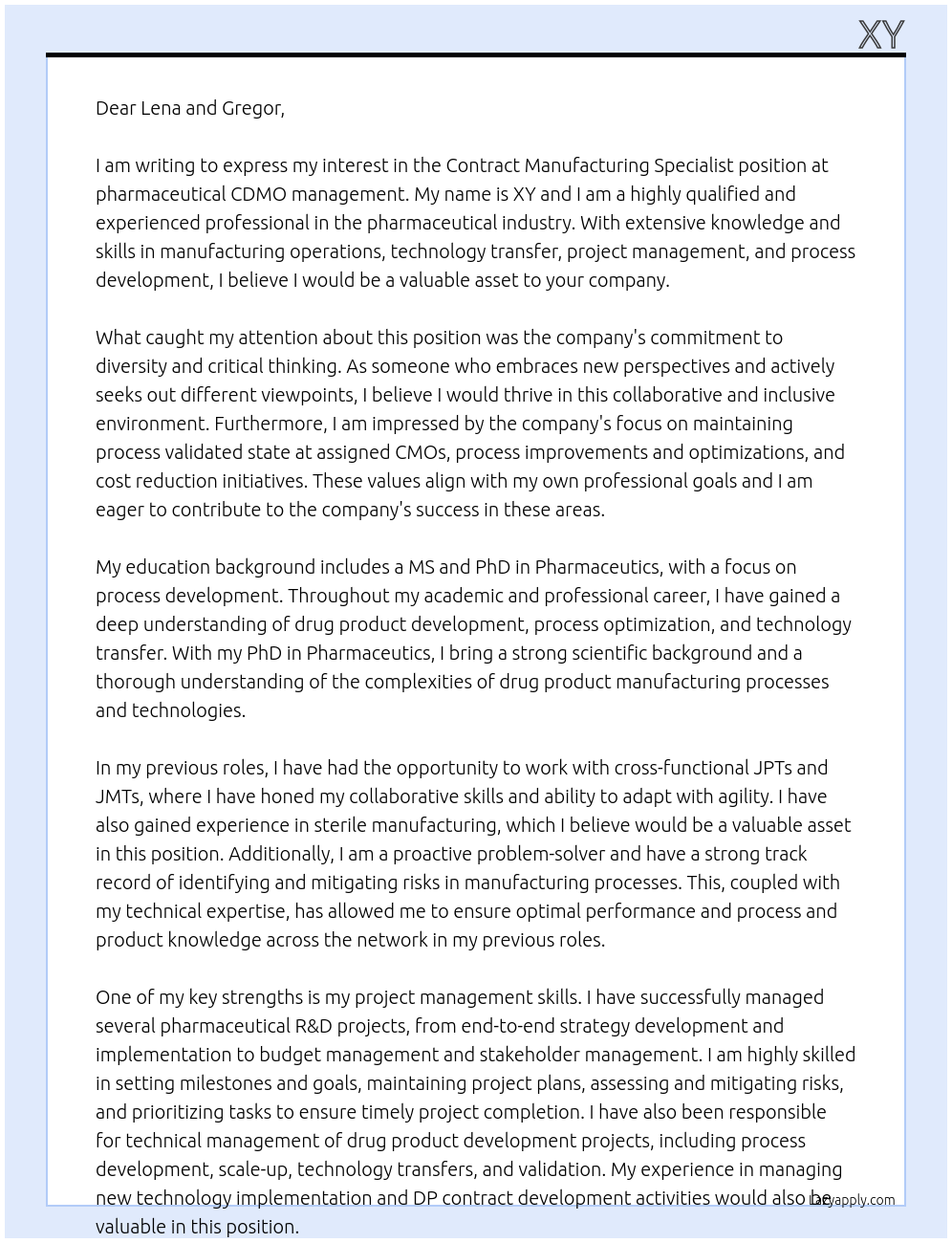 Contract Manufacturing Specialist Cover Letter At pharmaceutical CDMO management