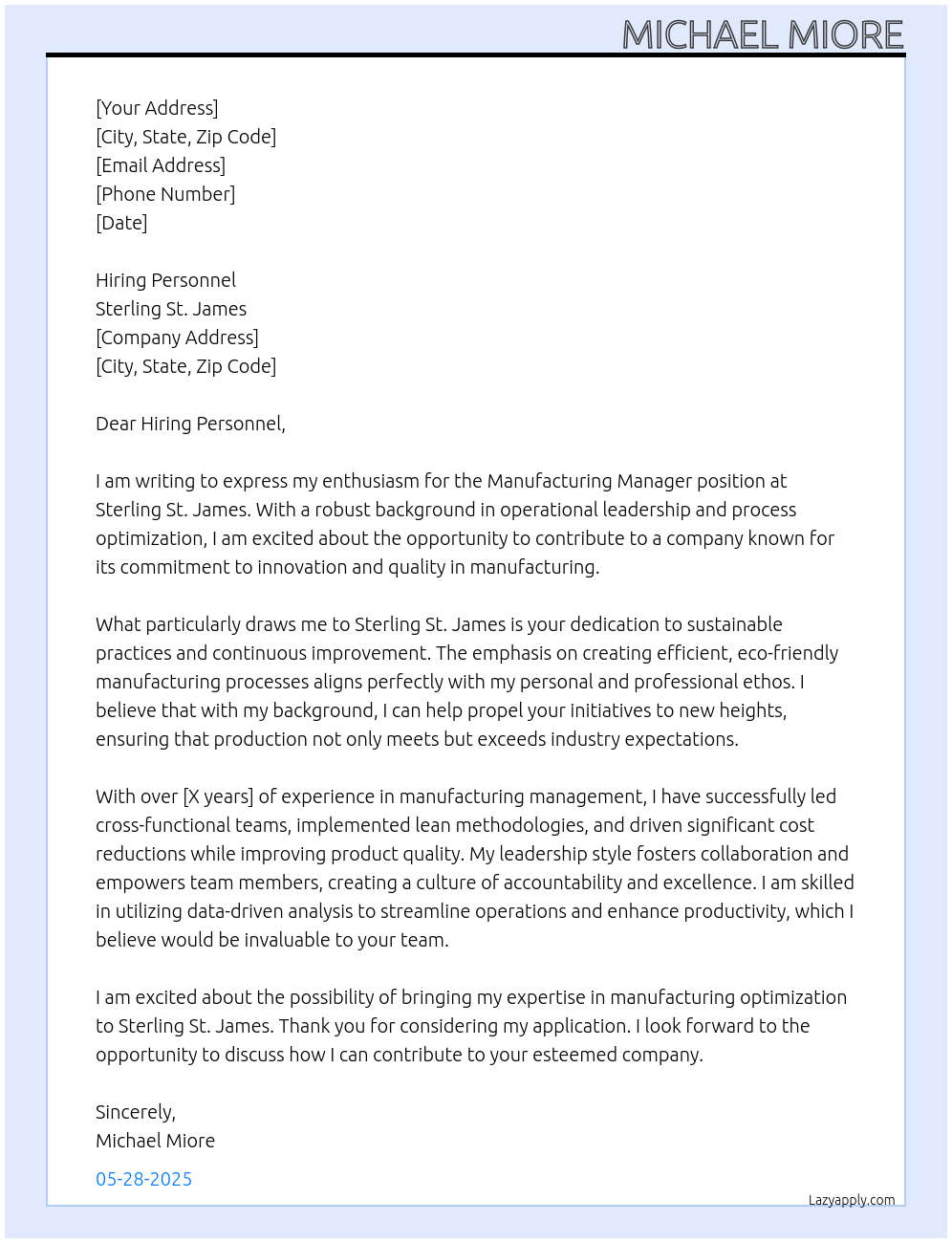 Check out these manufacturing manager cover letter sample and examples previously used by job seekers to land on job interviews as manufacturing manager. Use our AI cover letter generator to create a personalized cover letter as manufacturing manager.