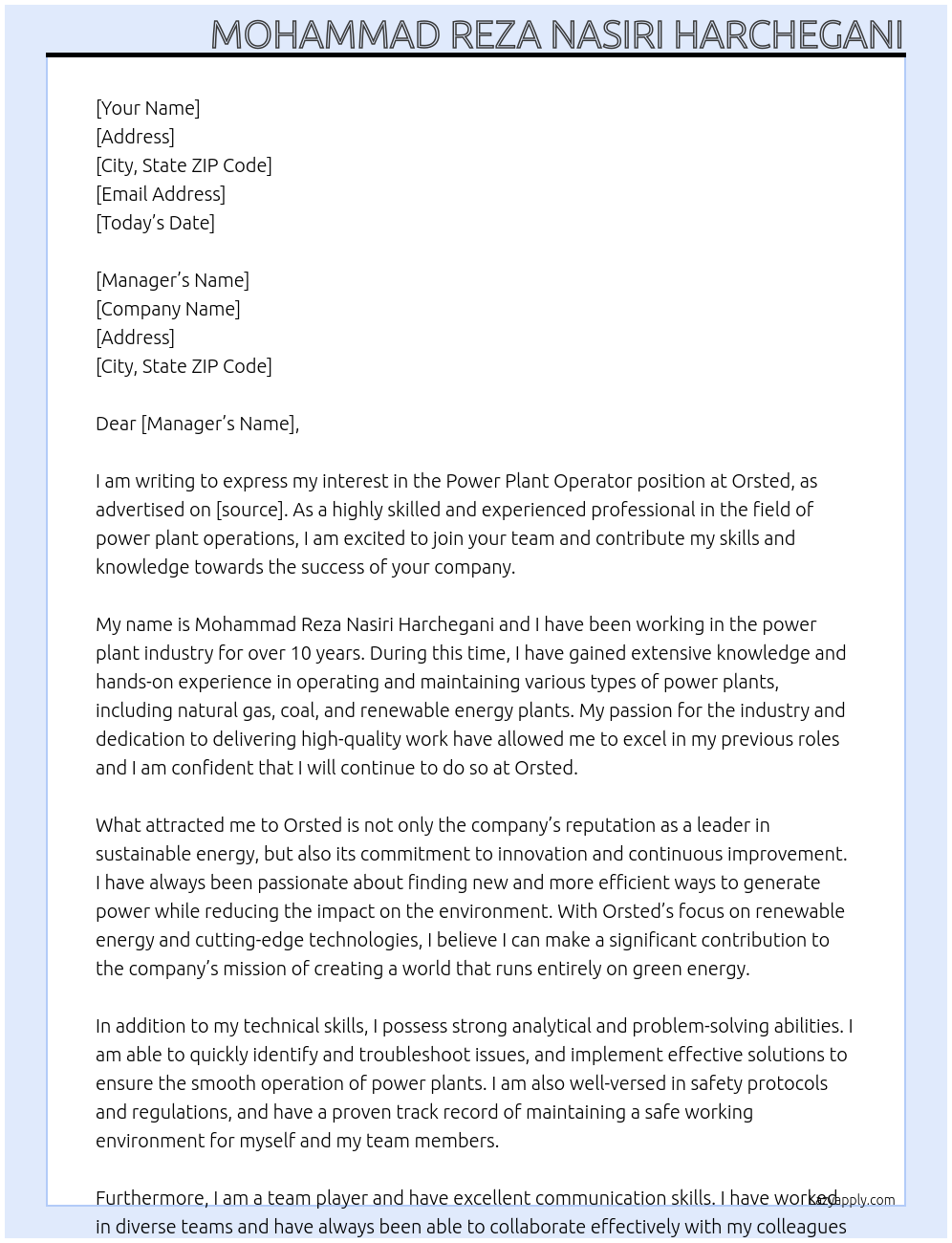 Check out these power plant operator cover letter sample and examples previously used by job seekers to land on job interviews as power plant operator. Use our AI cover letter generator to create a personalized cover letter as power plant operator.