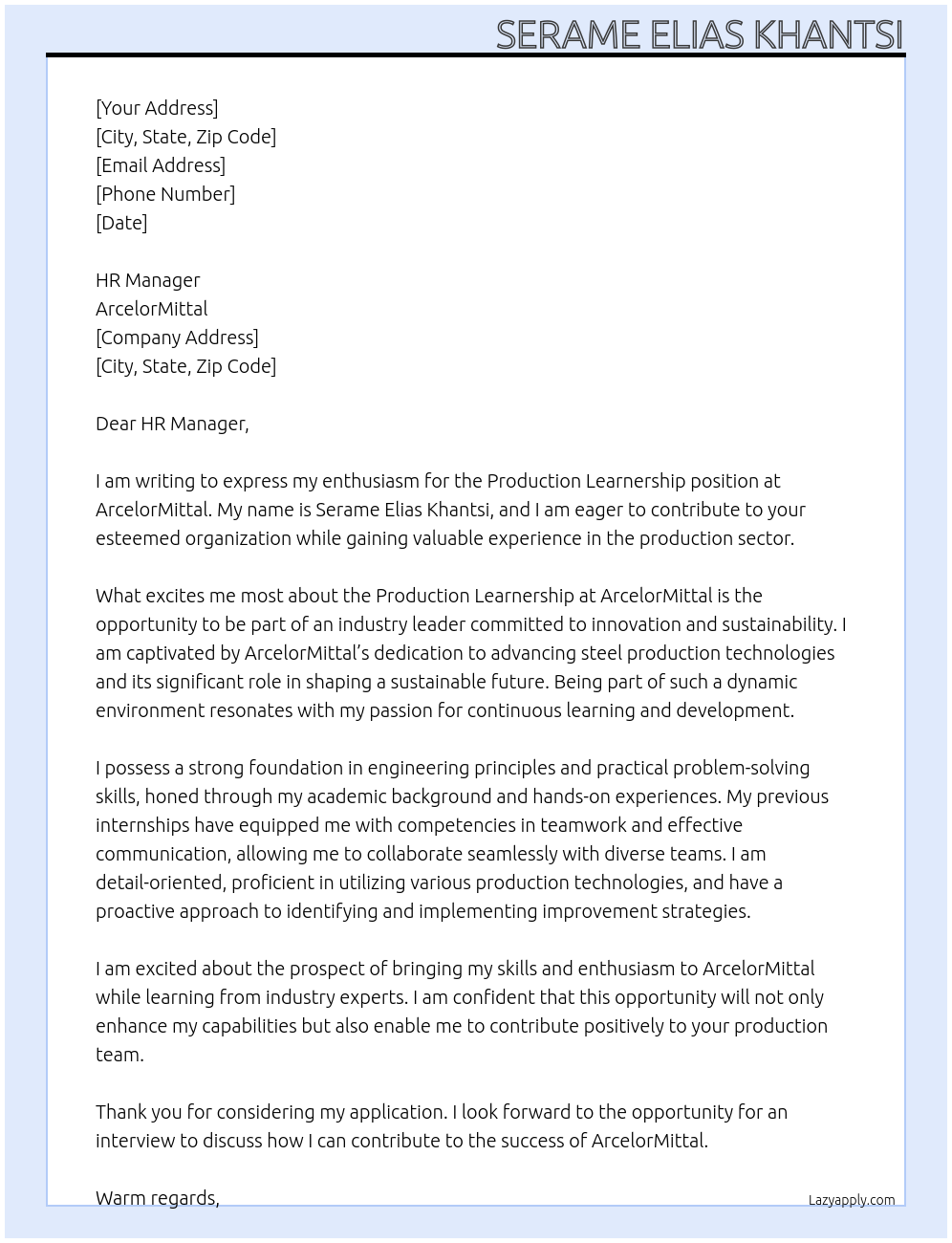 Production Learnership Cover Letter At Arcelormittal