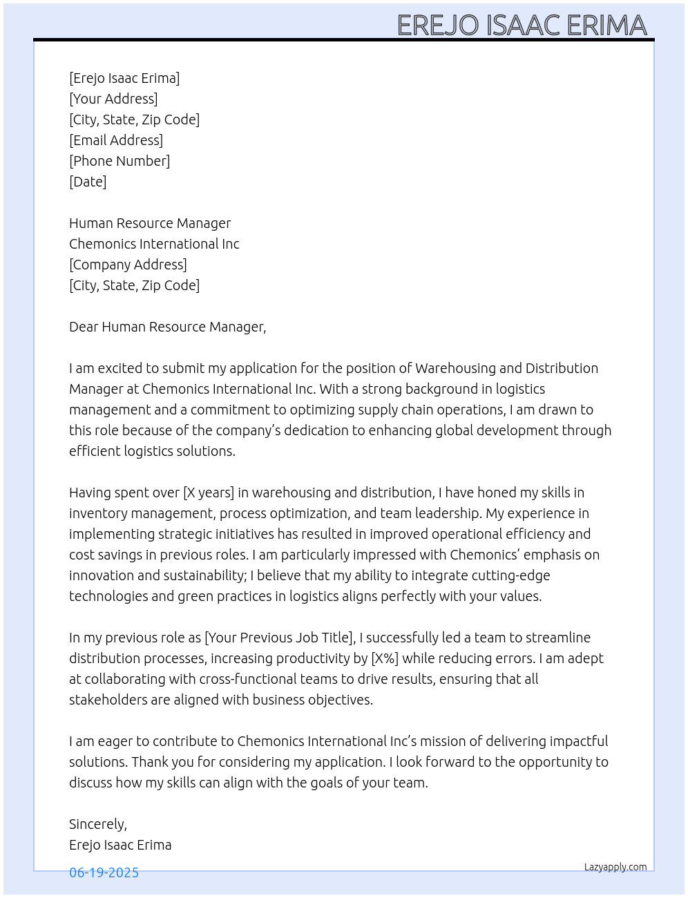 Warehousing and distribution Manager Cover Letter At Chemonics International Inc