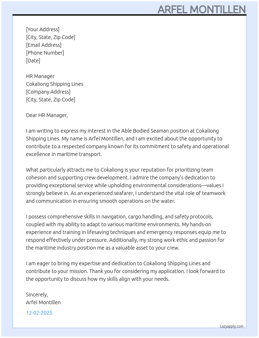 Check out these able bodied-seaman cover letter sample and examples previously used by job seekers to land on job interviews as able bodied-seaman. Use our AI cover letter generator to create a personalized cover letter as able bodied-seaman.