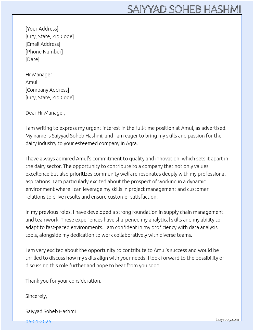 Amul Company Cover Letter