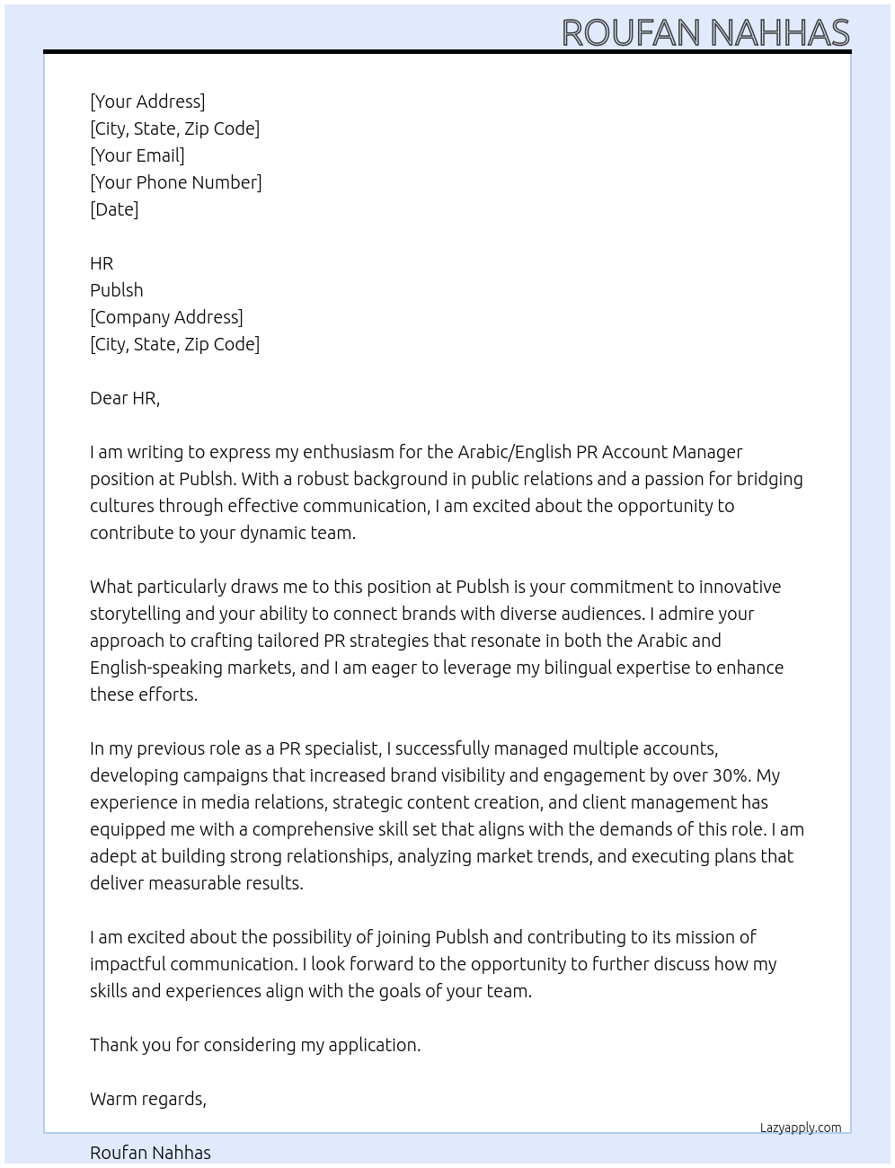 Arabic/English PR Account Manager Cover Letter At Publsh