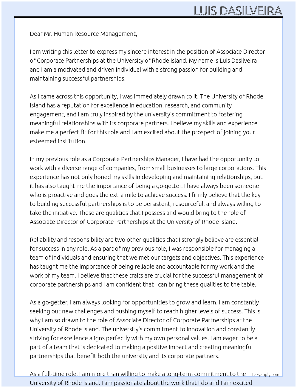 Associate director corporate partnership Cover Letter At University of Rhode Island