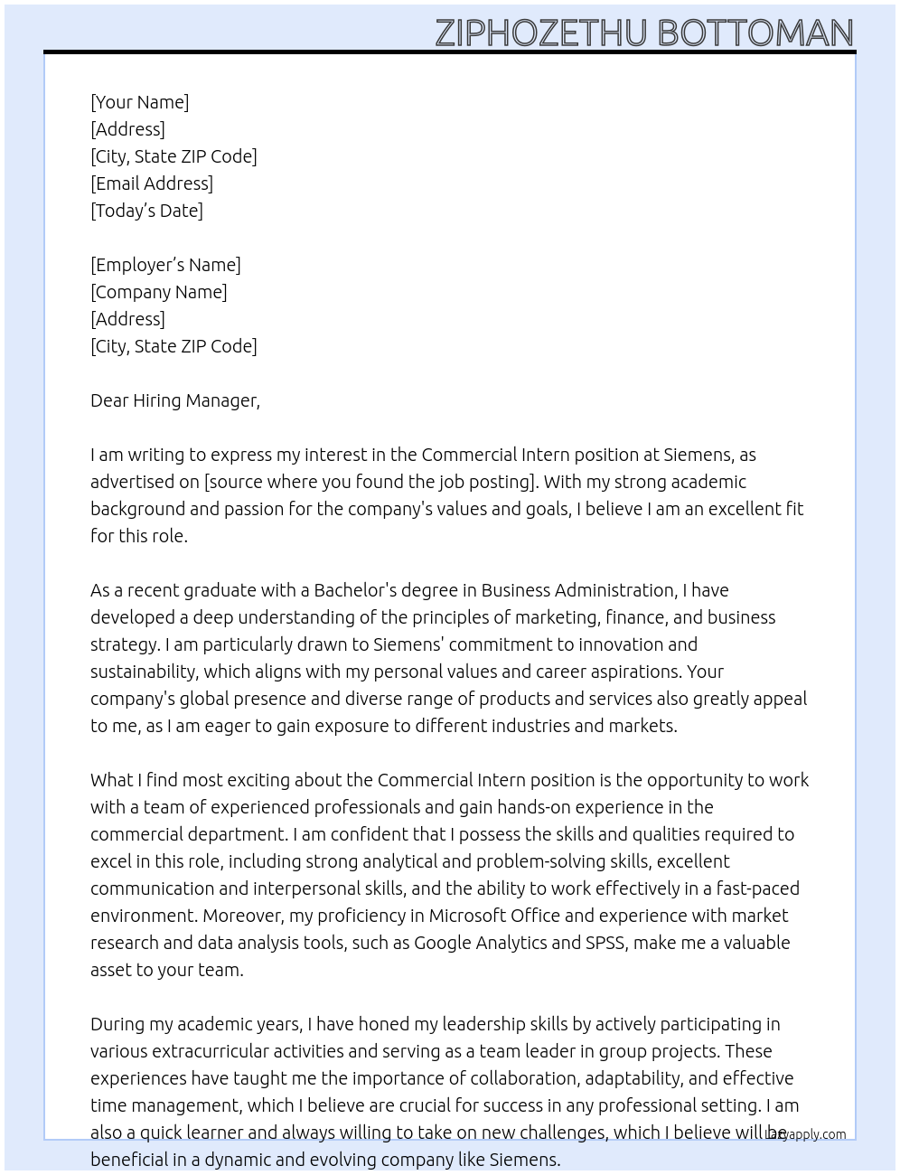 Check out these commercial intern cover letter sample and examples previously used by job seekers to land on job interviews as commercial intern. Use our AI cover letter generator to create a personalized cover letter as commercial intern.