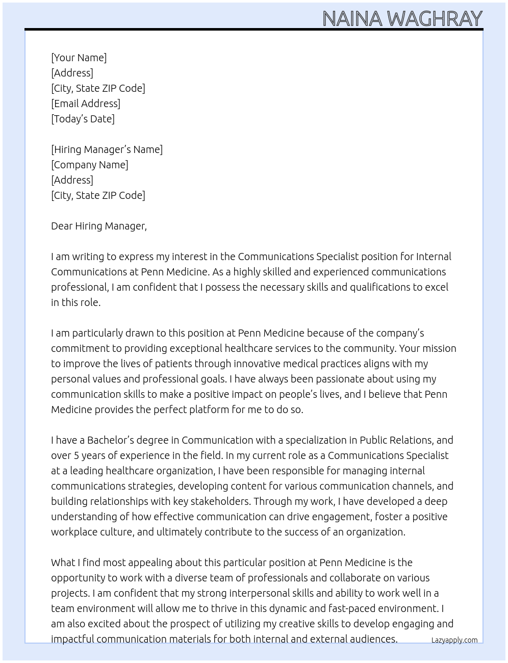 Communications Specialist - Internal Communications Cover Letter At Penn Medicine
