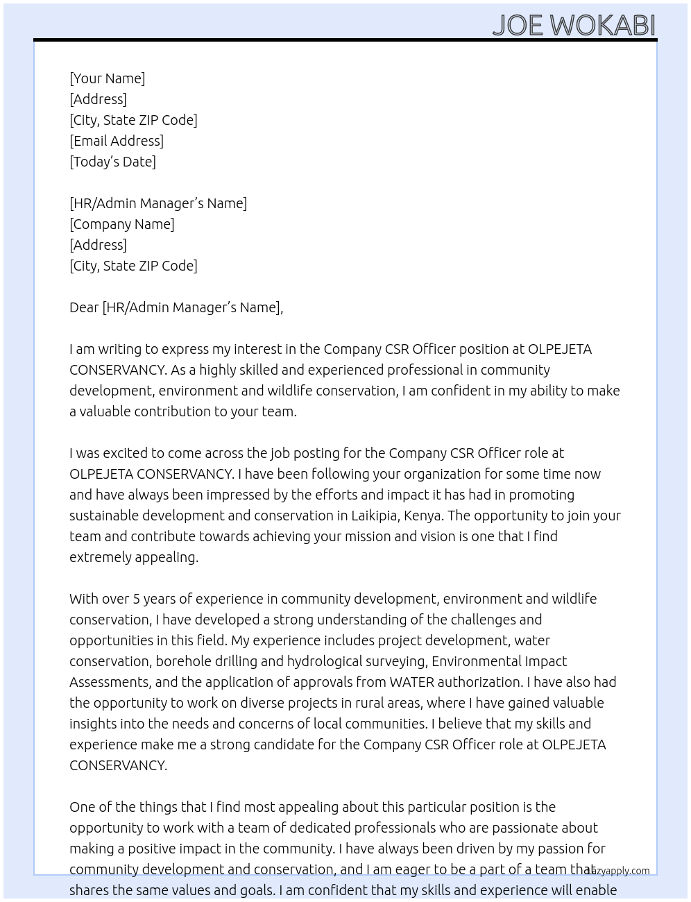 Company CSR Officer Cover Letter At OLPEJETA CONSERVANCY