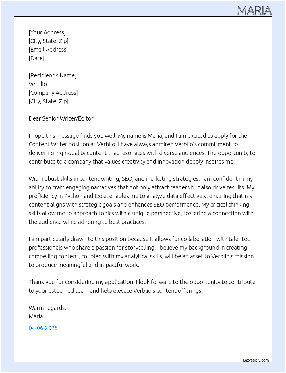 Check out these content writting cover letter sample and examples previously used by job seekers to land on job interviews as content writting. Use our AI cover letter generator to create a personalized cover letter as content writting.