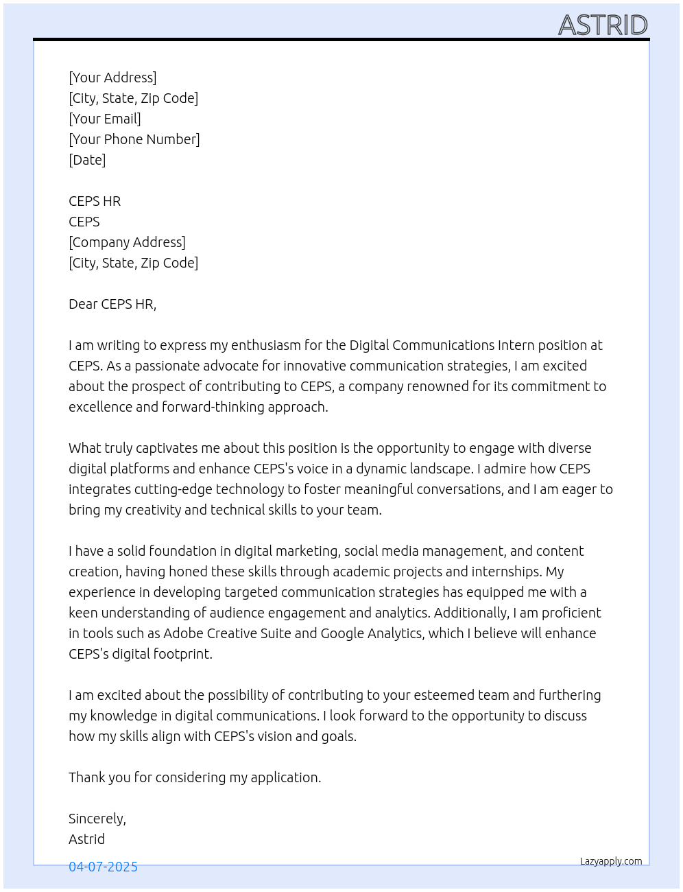Check out these digital communications intern cover letter sample and examples previously used by job seekers to land on job interviews as digital communications intern. Use our AI cover letter generator to create a personalized cover letter as digital communications intern.