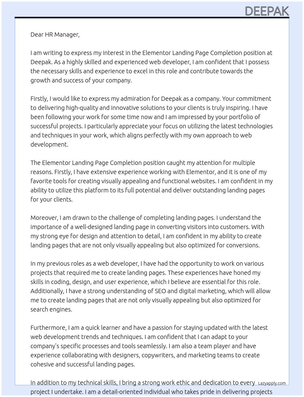 Elementor Landing Page Completion Cover Letter Examples And Template