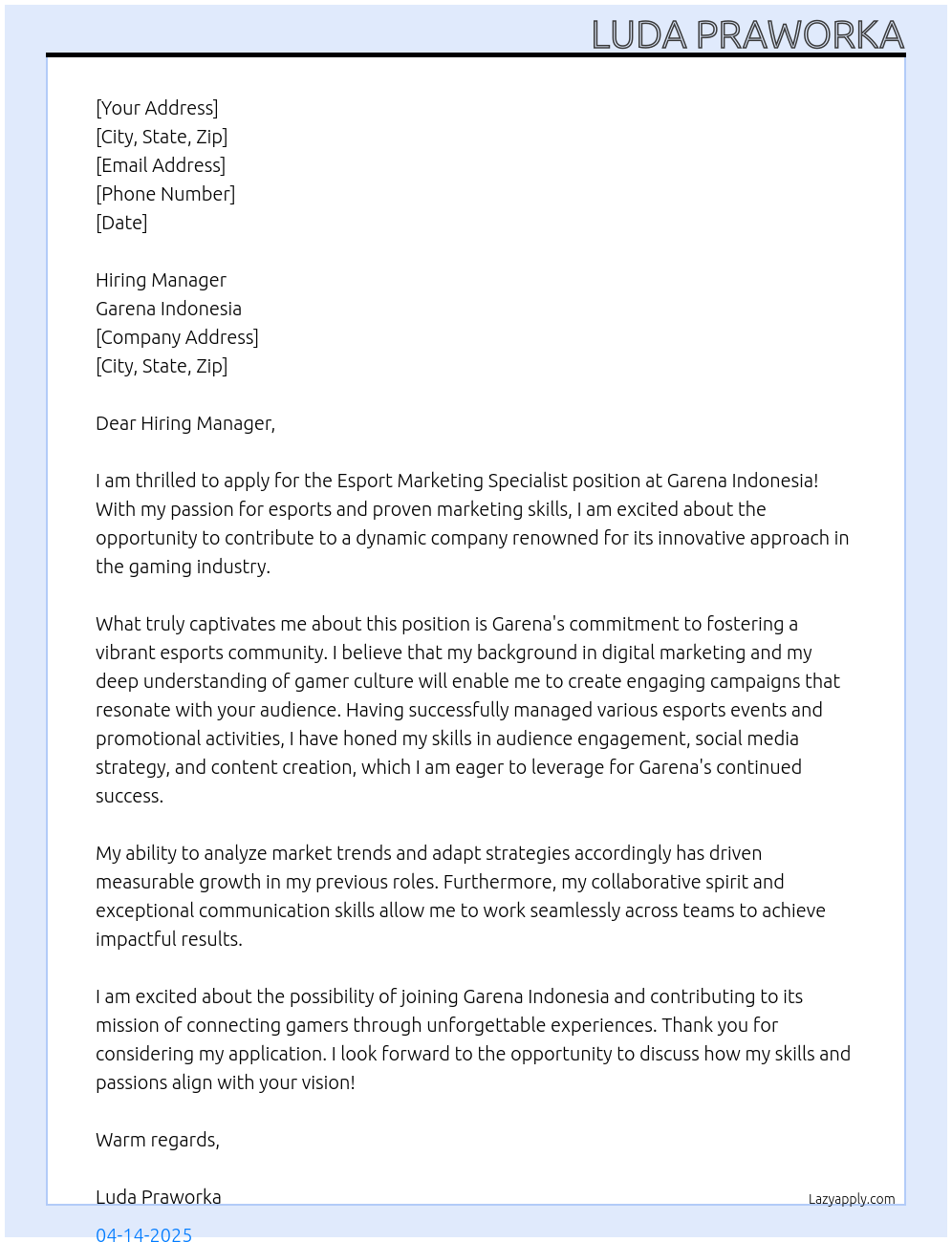 esport marketing specialist Cover Letter At Garena Indonesia