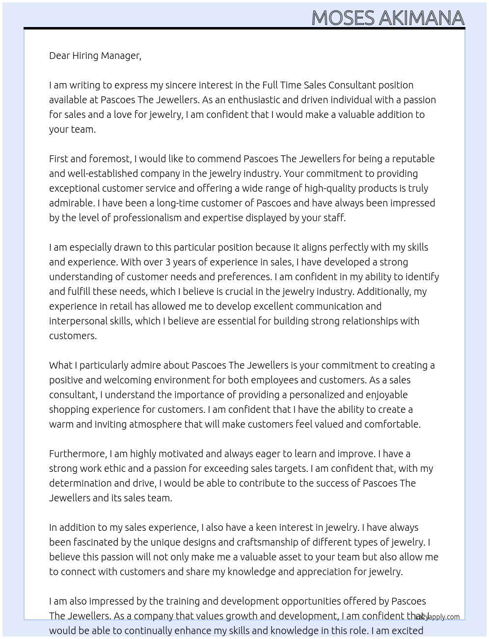 Full Time Sales Consultant Cover Letter At Pascoes The Jewellers