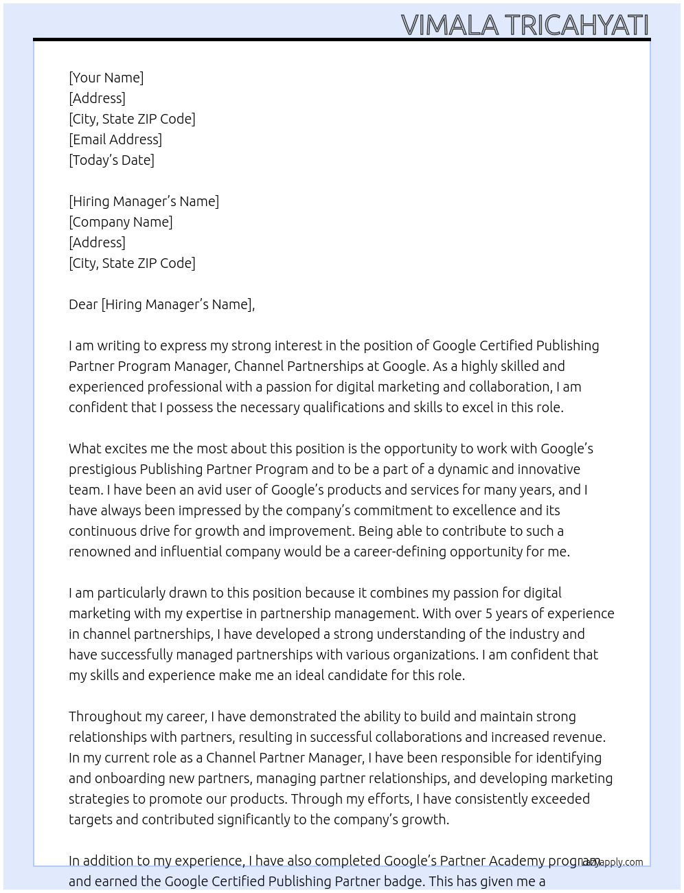 Google Certified Publishing Partner Program Manager, Channel Partnerships Cover Letter Examples And Template