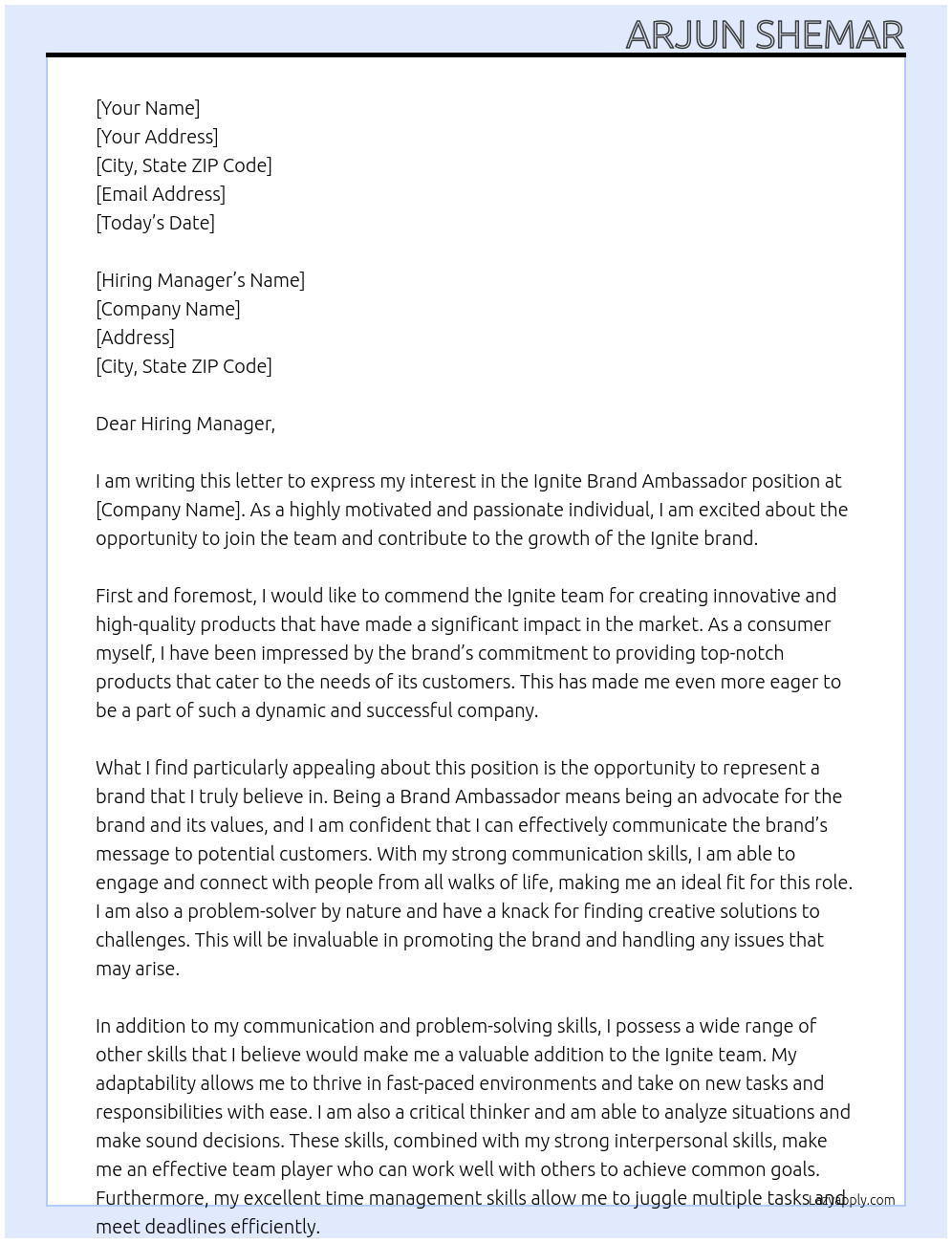 Ignite Brand Ambassador Cover Letter Examples And Template