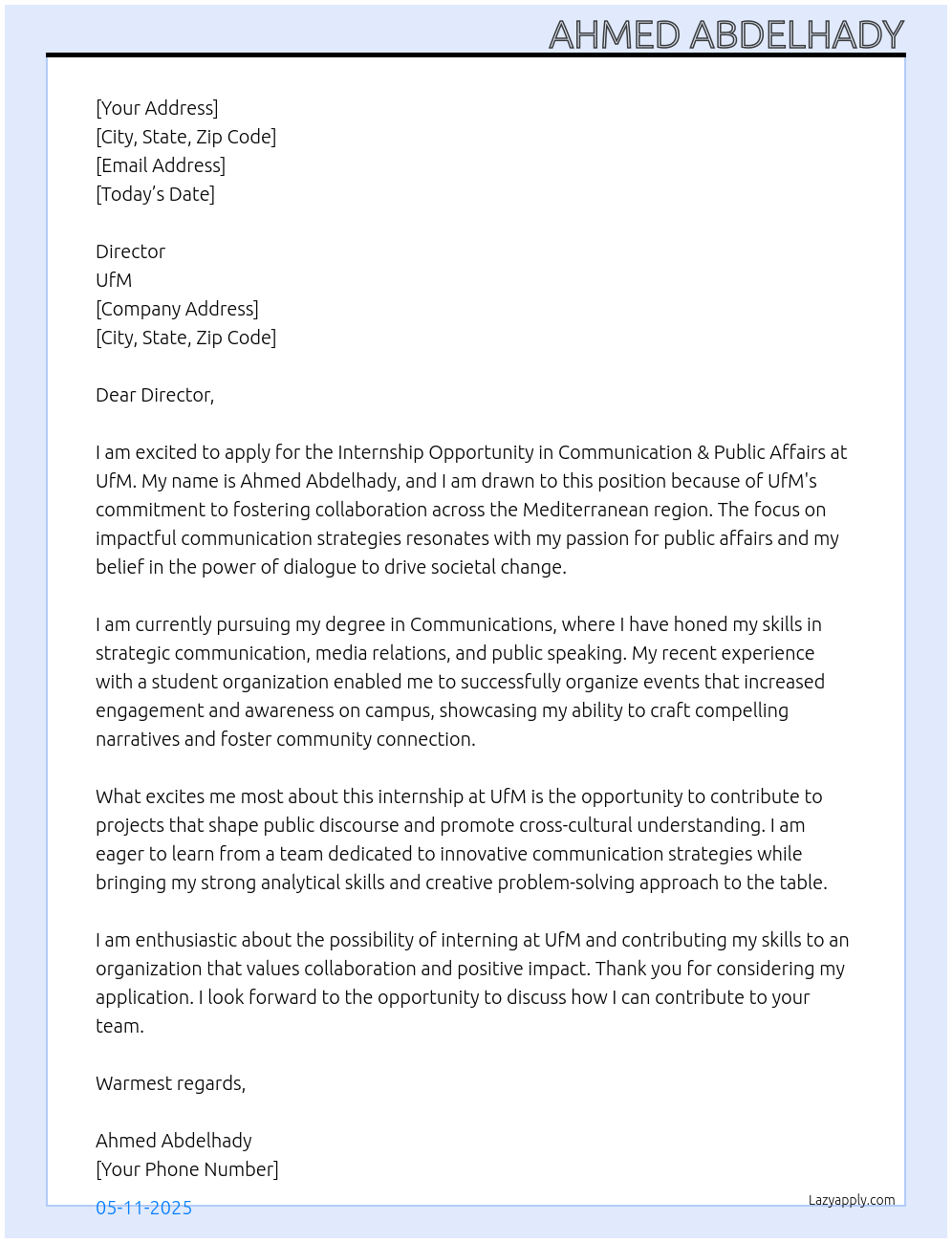 Internship Opportunity – Communication & Public Affairs Cover Letter At UfM