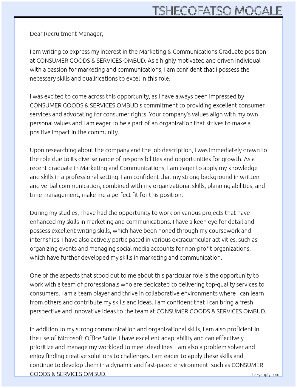 Marketing & Communications Graduate Cover Letter At CONSUMER GOODS & SERVICES OMBUD
