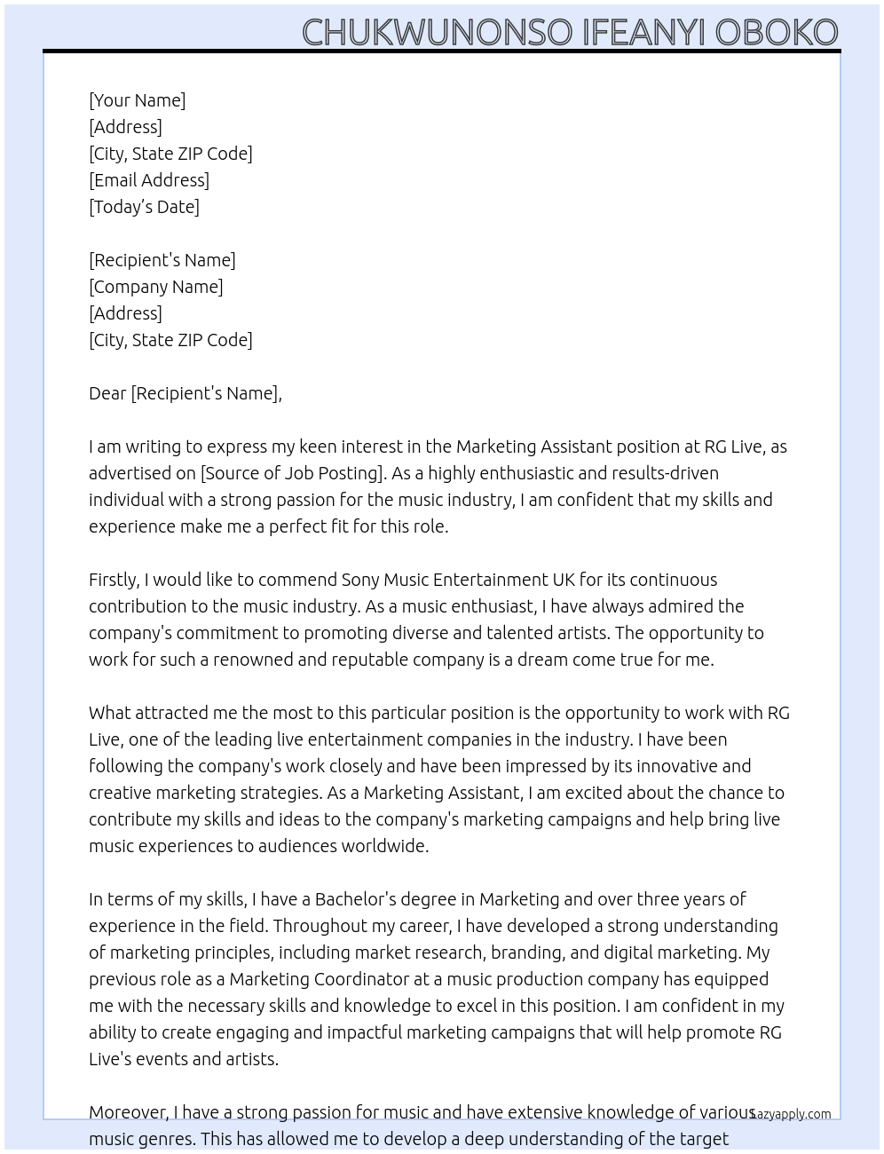 Marketing Assistant - RG Live Cover Letter At Sony Music Entertainment UK