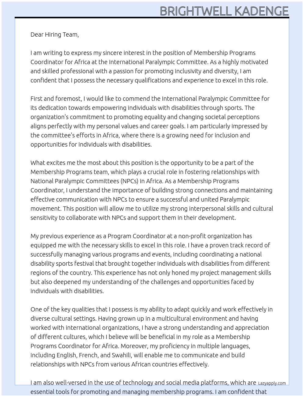 MEMBERSHIP PROGRAMS COORDINATOR - AFRICA Cover Letter At International Paralympic Commitee