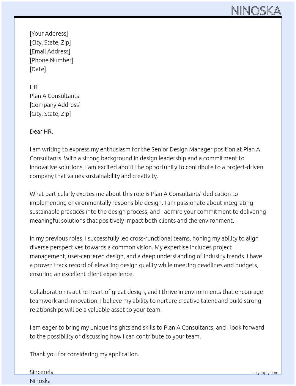 Check out these senior design manager cover letter sample and examples previously used by job seekers to land on job interviews as senior design manager. Use our AI cover letter generator to create a personalized cover letter as senior design manager.