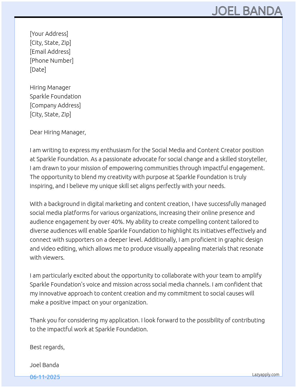 Social Media and Content Creator Cover Letter At Sparkle Foundation
