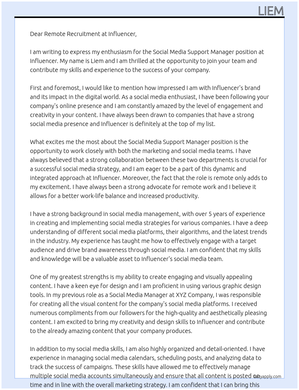 Check out these social media support manager cover letter sample and examples previously used by job seekers to land on job interviews as social media support manager. Use our AI cover letter generator to create a personalized cover letter as social media support manager.